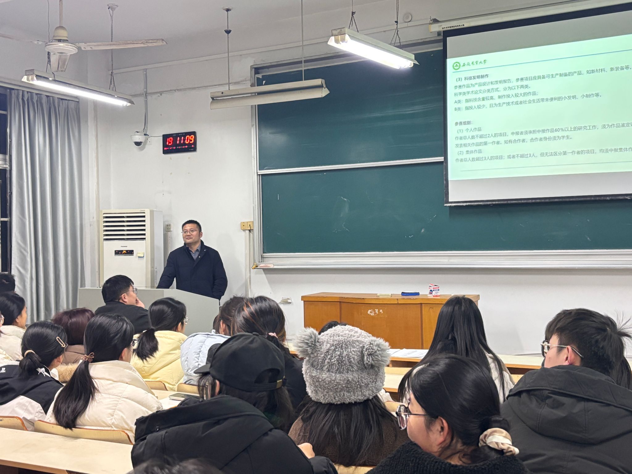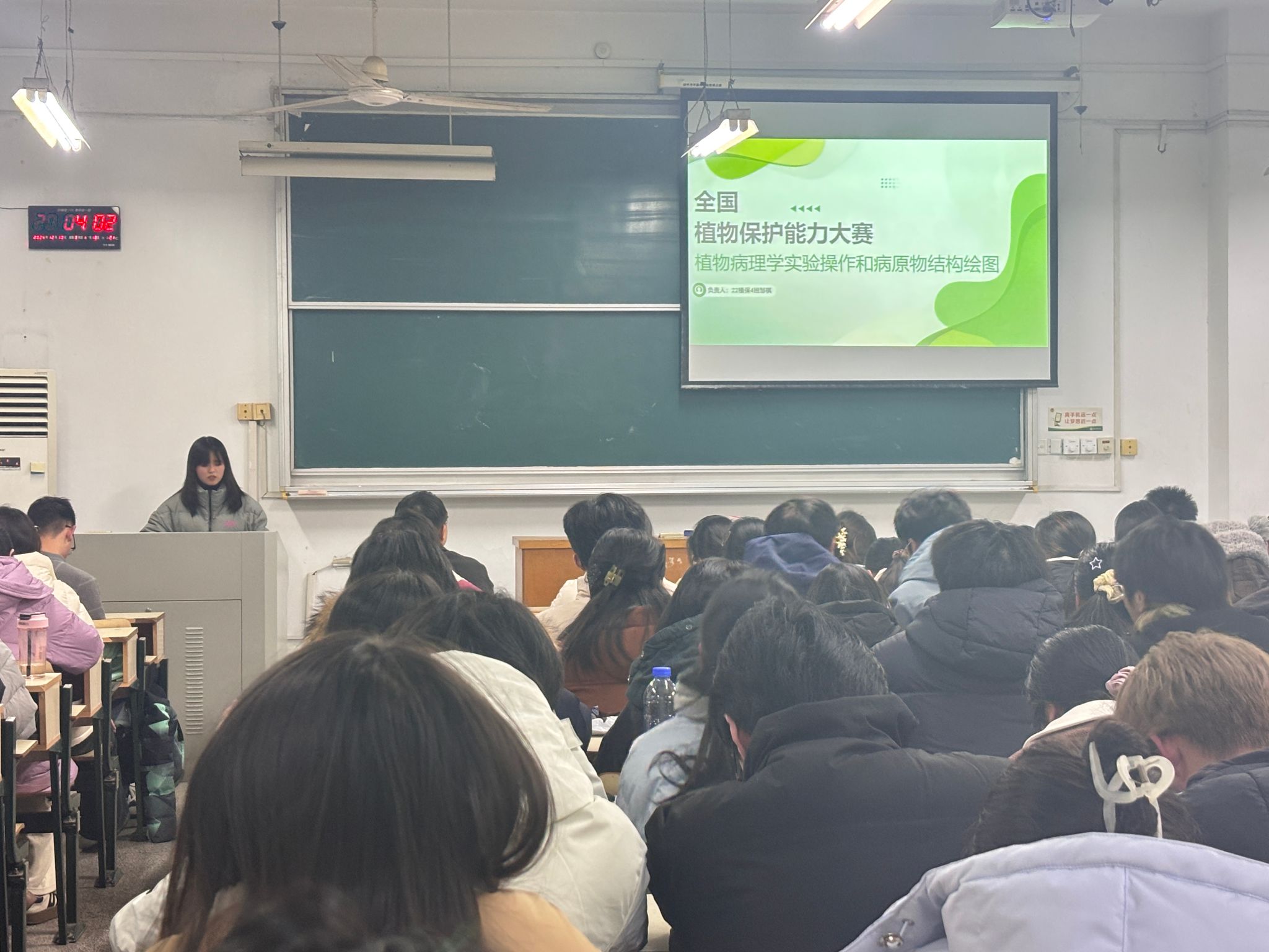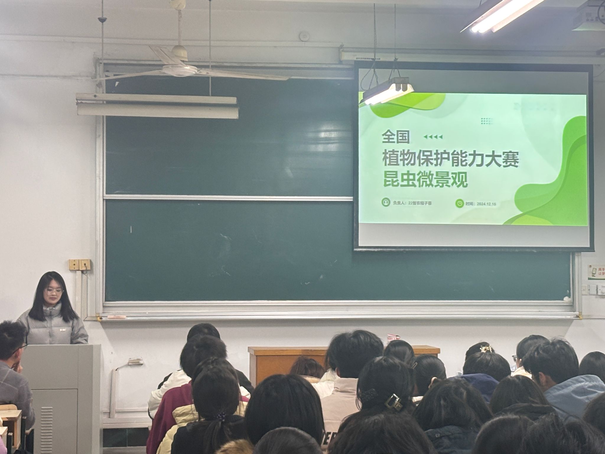本网讯 为进一步培养大学生科技创新能力与本领,不断提升“挑战杯”竞赛等其他创新创业类比赛的作品水平。12月18日晚,植物保护学院在勤学楼216教室举办了第十七届“兴农杯”大学生课外学术科技作品竞赛启动暨创新创业培训会。此次活动邀请到校党委组织部、创新创业优秀指导教师丁朝阳作专题培训,同时邀请2023年获得第十八届“挑战杯”全国大学生课外学术科技作品竞赛特等奖的代表吴琪和第四届全国大学生植物保护专业能力大赛的参赛队员作经验交流分享。