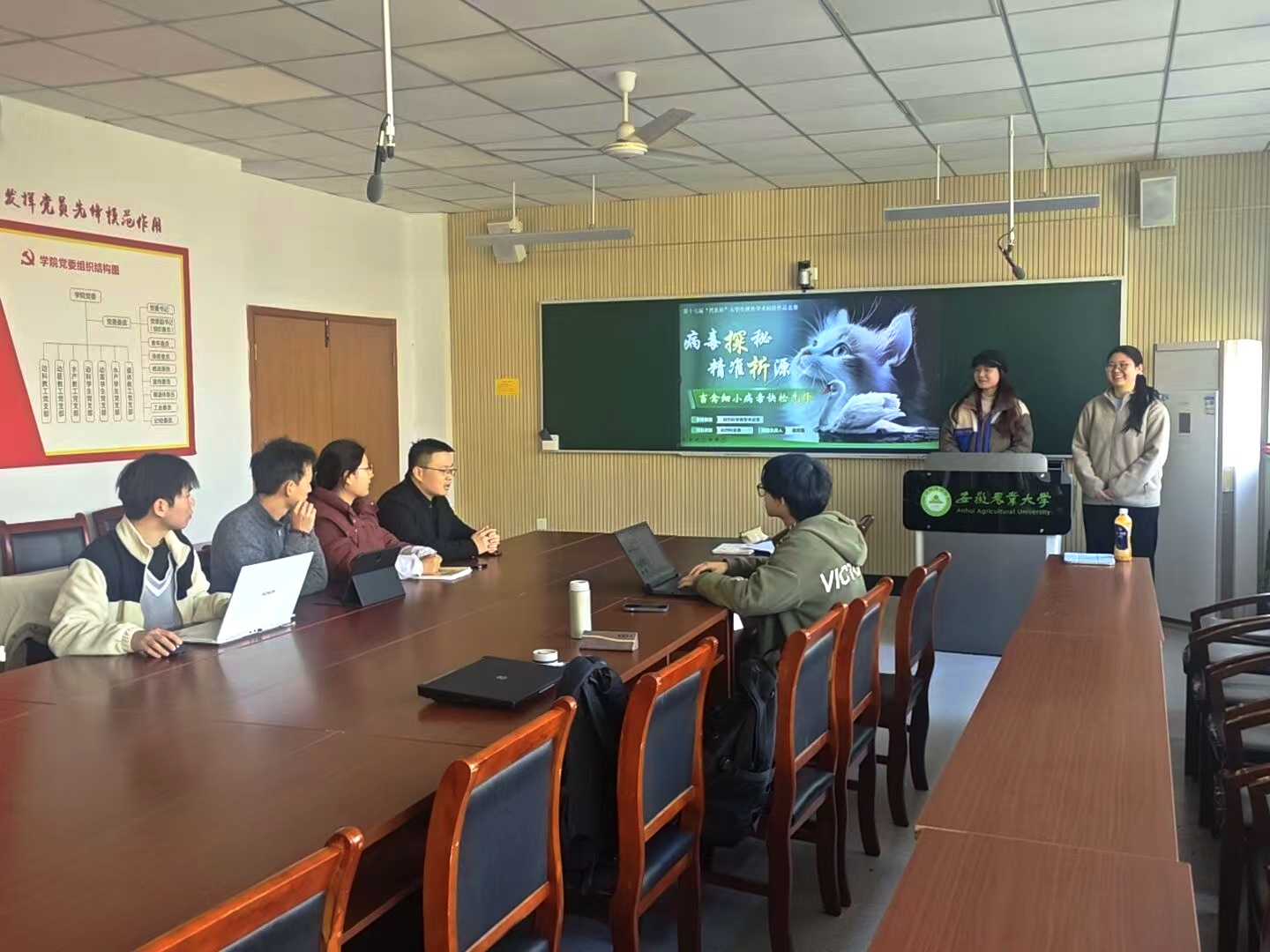 会上,项目团队负责人从项目背景与目标、技术研发进展、已取得的成果以及团队合作等方面做了详细汇报。团队准备充分、汇报内容详实、数据精准,充分展示了动物医学院学子在学术科研道路上的努力、严谨和创新。