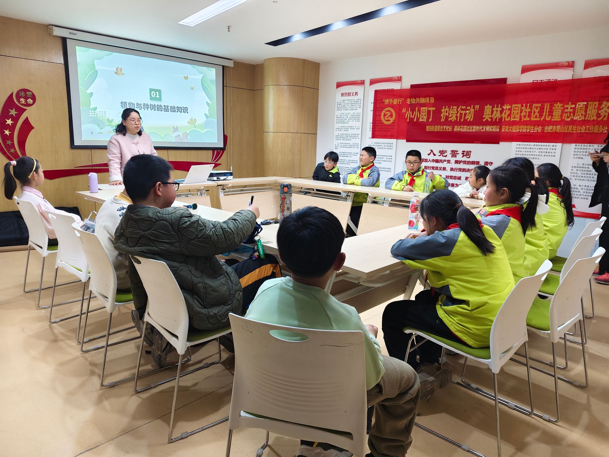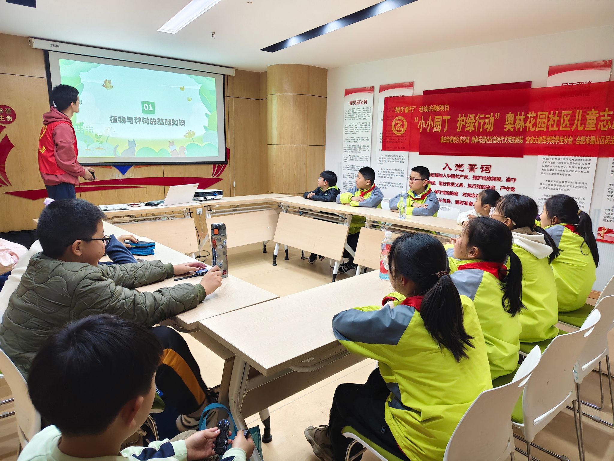 下午四点,阳光洒满奥林花园,活动在一片温馨的氛围中开启。志愿者们精心准备了生动有趣的PPT,利用专业所学,为小朋友们详细科普种树知识。文字、图片,加上有趣的动画,志愿者将种树护树变得妙趣横生。