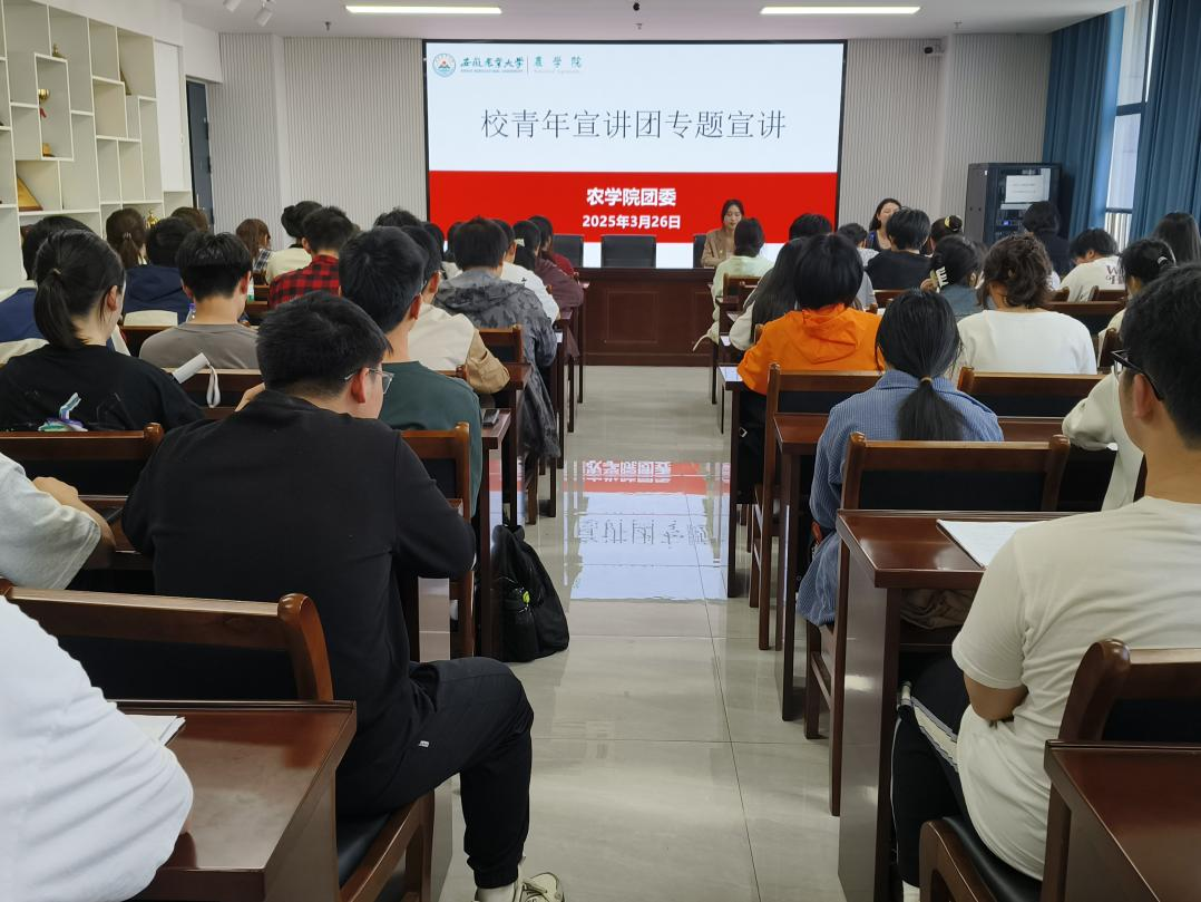 本网讯 为深入学习宣传贯彻党的二十大精神和党的二十届二中、三中全会精神,认真贯彻落实习近平总书记关于青年工作的重要思想,3月26日下午,一场意义非凡的专题宣讲活动在朝阳楼 202 会议室热烈展开,校青年宣讲团走进农学院,为莘莘学子带来了一场思想的盛宴。