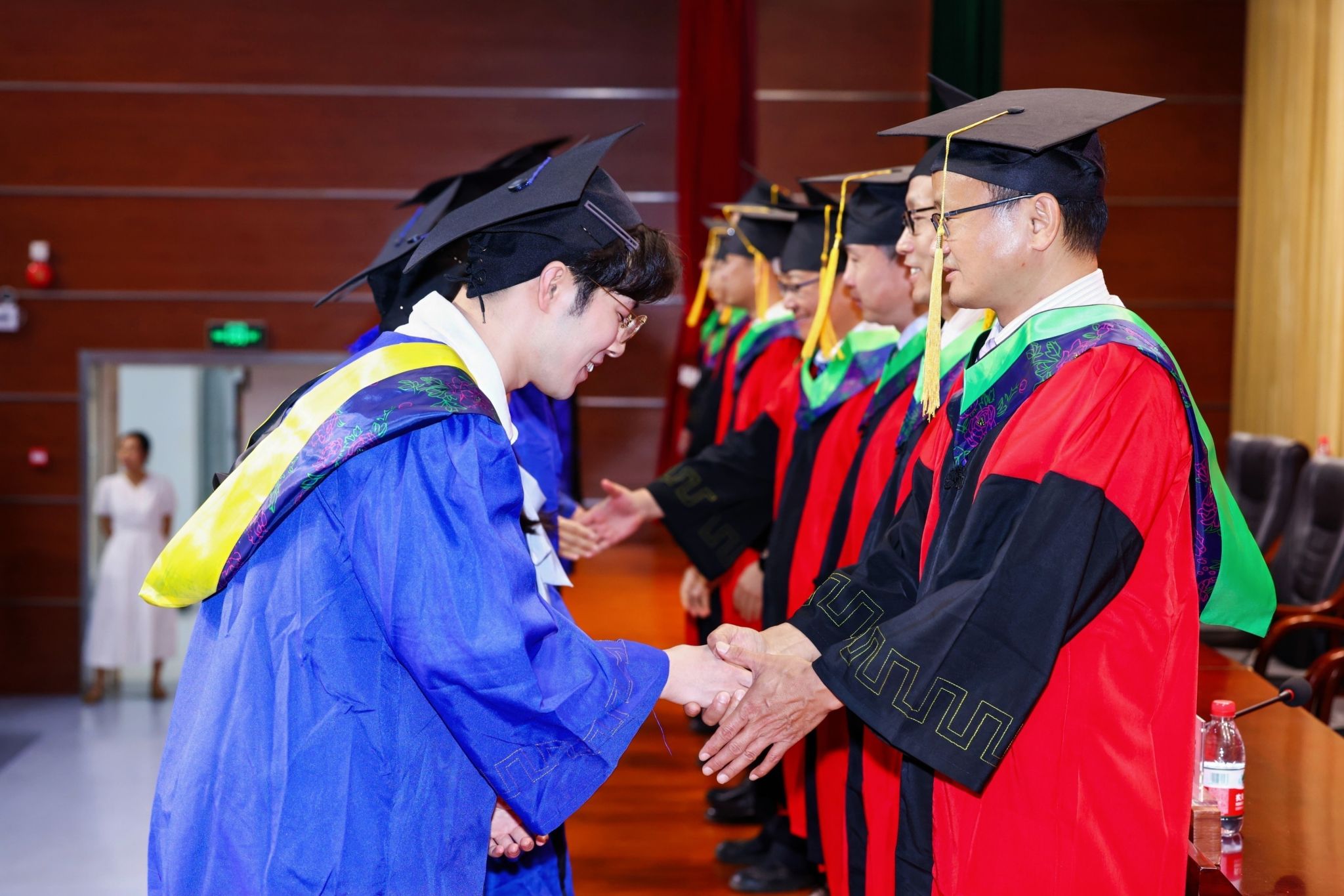 在学位授予仪式上,身着学位服的毕业生们依次登台。学院导师团成员庄重地为博士毕业生、硕士毕业生、本科毕业生扶正流苏,并合影留念。象征学有所成的拨穗瞬间,定格了青春奋斗的硕果,也开启了人生崭新的征程,全场掌声经久不息。