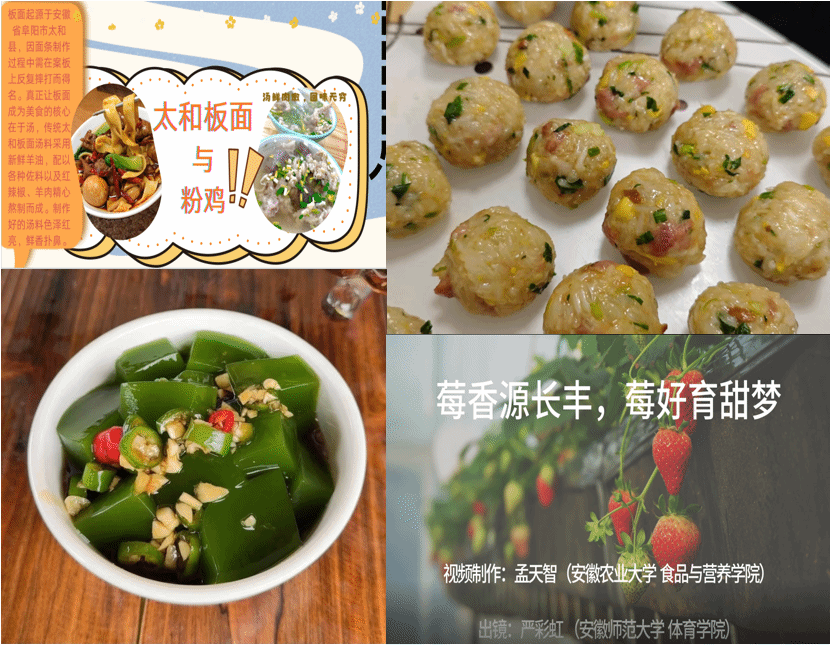 2024级食品科学与工程吴安可、2023级食品科学与工程胡雅君分别通过制作泰顺绿豆腐、炸圆子介绍从食材准备、制作工艺、火候把握的全过程,分享其中的温馨与乐趣,展现对传统美食的坚守;2023级食品质量与安全罗雨杰、2023级食品科学与工程吴宇彤通过制作美食宣传图,分别介绍了太和板面、黄山臭鳜鱼等家乡的特色美食;2022级食品卫生与营养学孟天智及团队成员,走进家乡长丰的草莓园,通过拍摄微视频,介绍一颗颗“红果果”的致富密码,让更多的人了解长丰,爱上长丰。