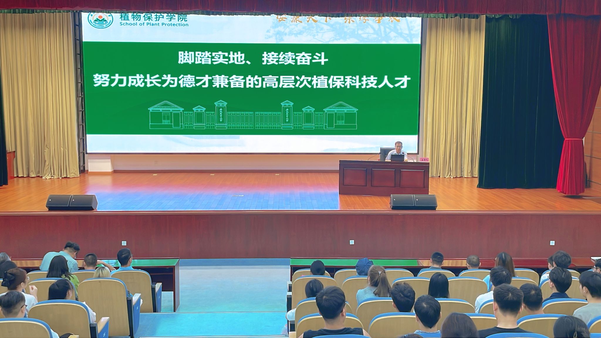 本网讯 9月2日晚,植物保护学院在图书馆第一报告厅举行“植”等你来——2025级本科和研究生新生开学典礼。学院党政领导、系主任、教师代表,2025级新生及辅导员、班主任出席典礼,典礼由学院党委书记刘柳主持。