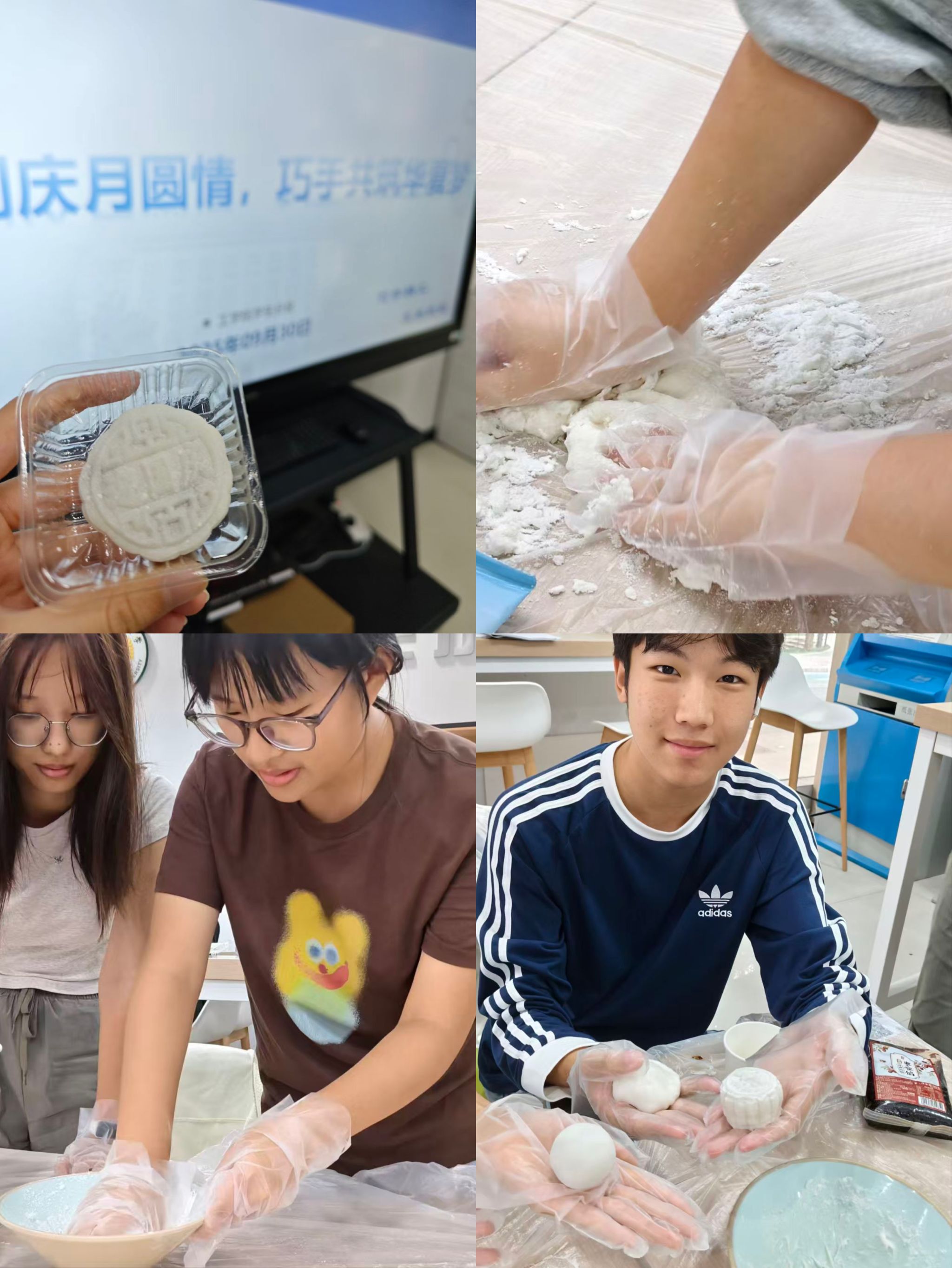 活动现场,大家分工协作,和面、称重、包馅、压模......一双双巧手在面团与馅料间翻飞。尽管很多同学是第一次尝试,手法略显生疏,制作的月饼形态各异,但整个过程充满了探索与合作的乐趣。不一会儿,印有“祝福”“团圆”等吉祥图案和字样的月饼便整齐地排列在烤盘中,每一枚都饱含着同学们对亲友的思念、对团圆的期盼以及对祖国繁荣昌盛的美好祝愿。
