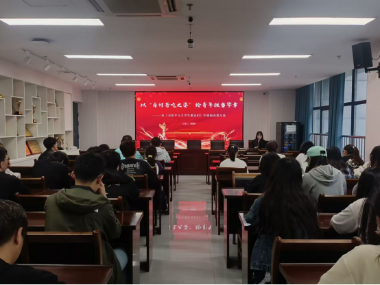 此外,会议还邀请了校青年宣讲团成员、林学与园林学院2023级城乡规划专业学生刘韵暄作专题宣讲,宣讲主题为《从<习近平与大学生朋友们>中汲取奋进力量》。刘韵暄以“自讨苦吃” 精神为主线,从“自讨苦吃的精神密码”“自讨苦吃的行动纲领”“自讨苦吃的时代答卷”三个篇章展开,结合当代大学生成长案例与社会发展实践,生动阐释新时代青年应如何立足学业、勇担使命,为国家发展与社会进步贡献青春力量。