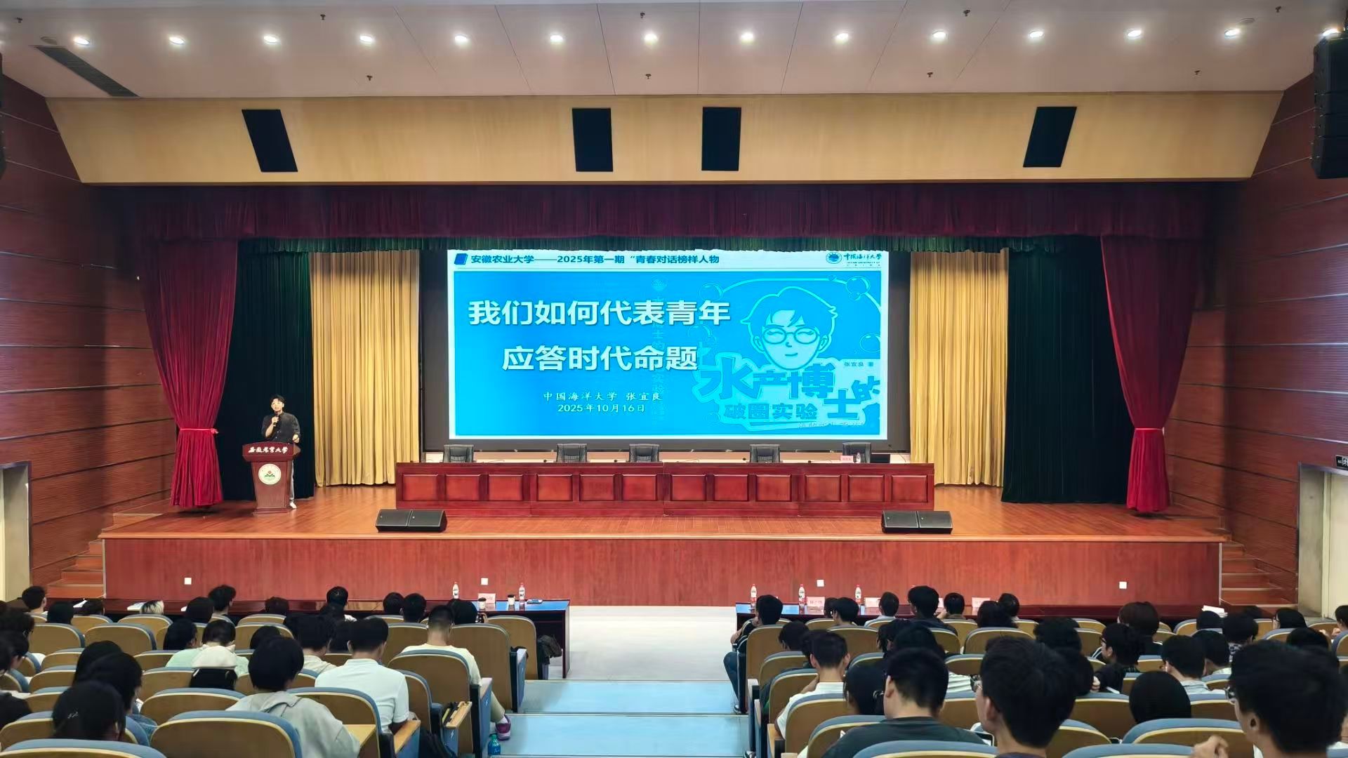 当晚,张宜良在学校图书馆第一报告厅作题为《后浪奔涌:我们如何代表青年,应答时代命题?》的报告。他以“养不出母鱼就无法毕业”事件为切入点,回顾自己11年求学科研历程,分享从实验失败到技术突破的困境,以及通过新媒体推动专业“破圈”的经历。他强调新时代青年要深耕专业,也要有跨界思维和公众表达能力。针对同学们关心的“冷门专业发展前景”等问题,他提出“避免盲目比较、放大自身差异点”的策略,鼓励走差异化发展道路。