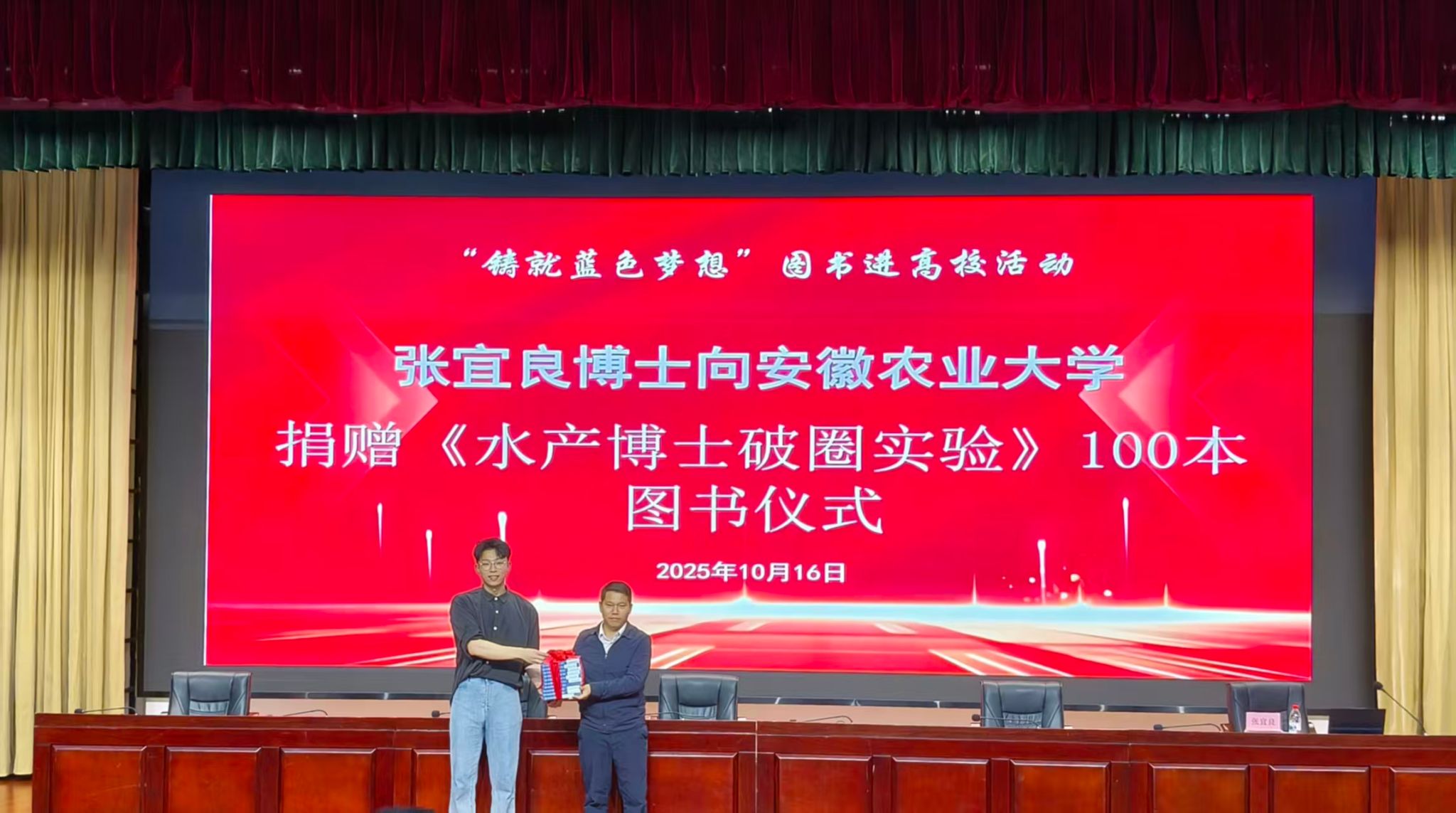 报告结束后,张宜良向学校捐赠100册个人新作《水产博士破圈实验》,并寄语青年要脚踏实地做科研,主动发声传知识。
