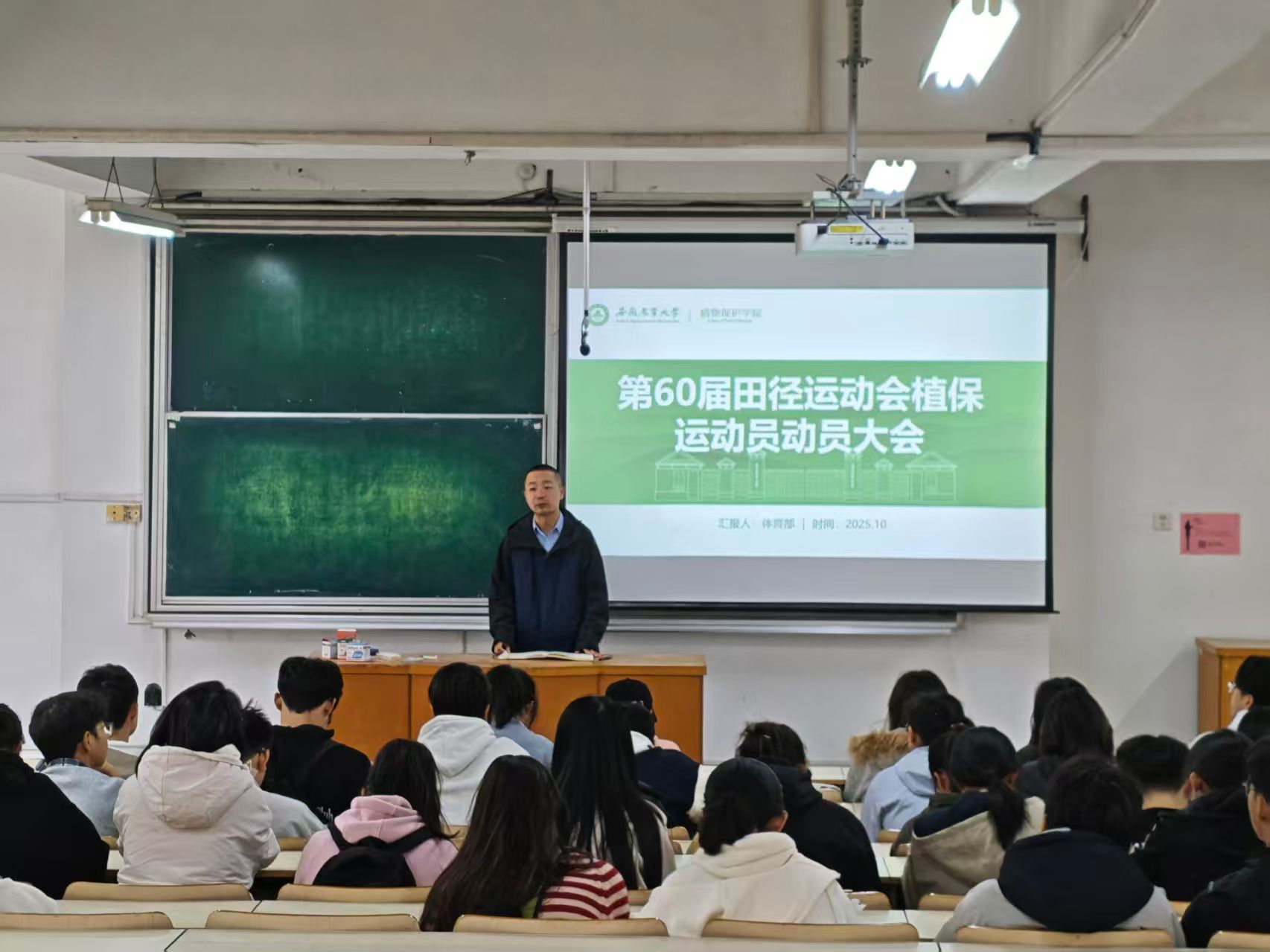 本网讯 10月21日中午,植物保护学院在勤学楼103教室召开校第60届田径运动会培训暨动员大会。院党委副书记郭振宇作动员讲话,院团委负责老师、学生分会相关负责人以及全体运动员参加会议。