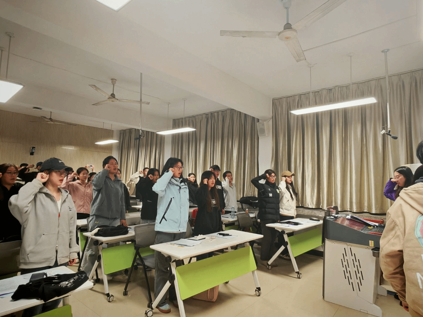 仪式现场,院团委老师围绕团的历史沿革、团员权利与义务、新时代青年使命担当等核心内容作了系统讲解,引导新发展团员深化对中国共产主义青年团的认识和理解,进一步端正入团动机。随后,老师详细解读入团志愿书填写规范,对填写格式、内容要点及注意事项进行逐项说明,着重强调志愿书填写的严肃性与规范性,确保每位新团员准确掌握填写要求。最后,在庄严的团旗下,全体新团员高举右拳,庄严宣誓,铿锵有力的誓言回荡现场,充分展现了青年一代的责任担当与青春风采。