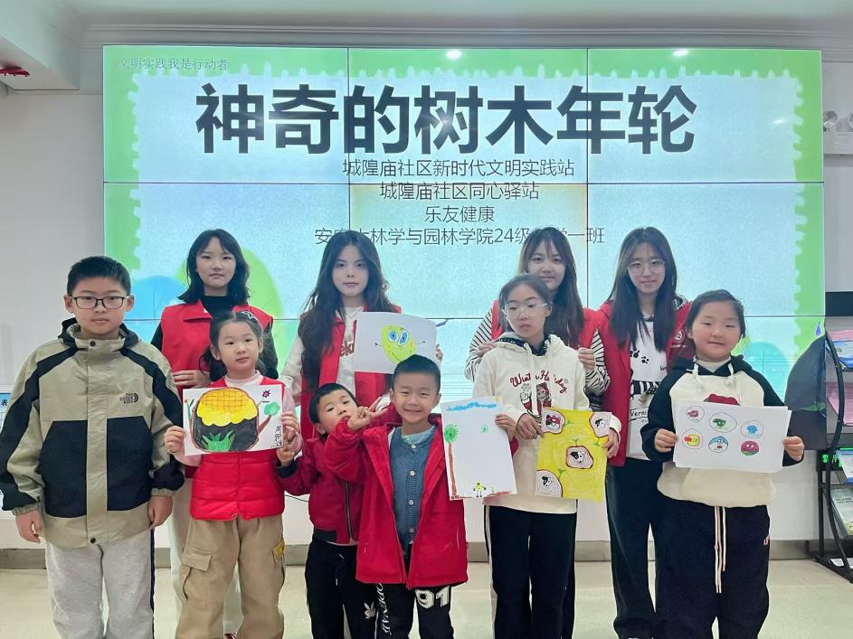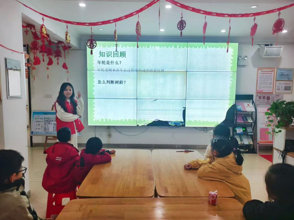 本网讯 为激发社区儿童探索自然科学的兴趣,11月13日下午,林学与园林学院5名大学生志愿者走进社区,开展了一场以《神奇的树木年轮》为主题的趣味科普讲堂,引导孩子们在年轮的纹理中读懂自然的故事。