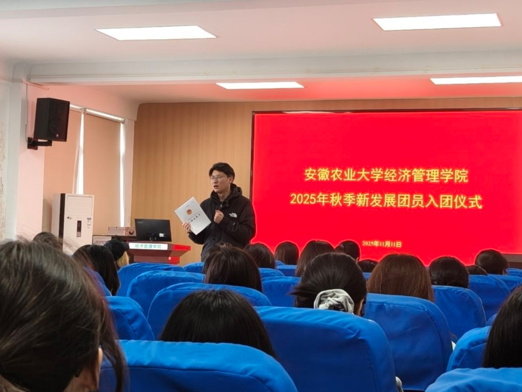 本网讯 11月11日,安徽农业大学经济管理学院2025年秋季新发展团员入团仪式在庄严的氛围中于经管楼321顺利举行。伴随着激昂雄壮的《光荣啊,中国共青团》团歌,仪式正式拉开帷幕。