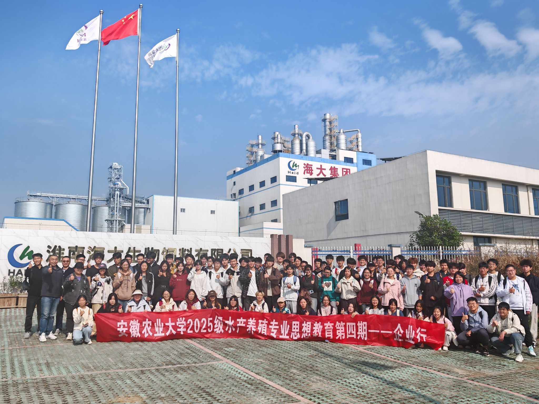 随后,师生一行前往淮南海大生物饲料有限公司。2010级校友王辉作为企业代表,介绍了公司发展历程、核心产品及行业影响力,并带领大家走进生产车间,近距离参观饲料全流程生产线,帮助新生明晰专业应用场景。