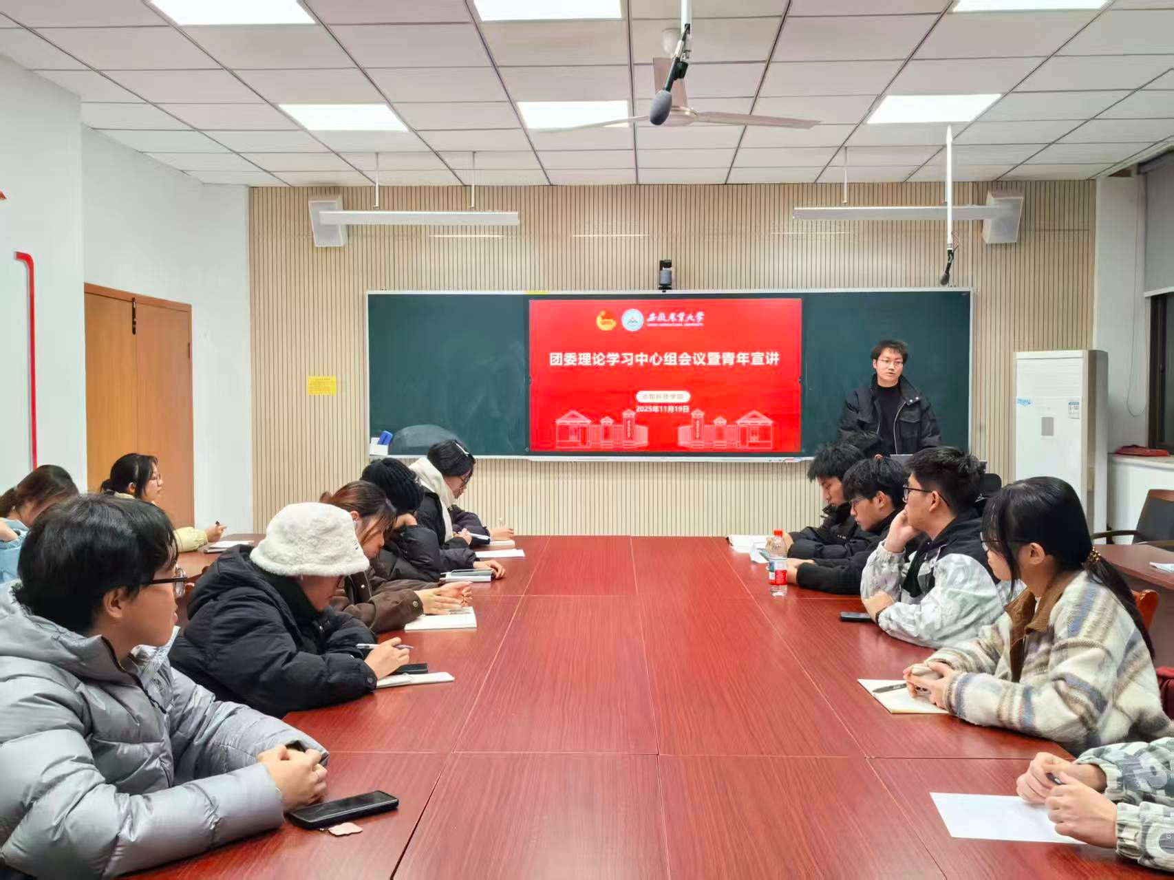 本网讯 11月19日晚,学院在动科楼306会议室组织开展团委理论学习中心组(扩大)会议暨青年宣讲,会议由院团委老师主持,团委理论学习中心组成员、各班级团支书参加。
