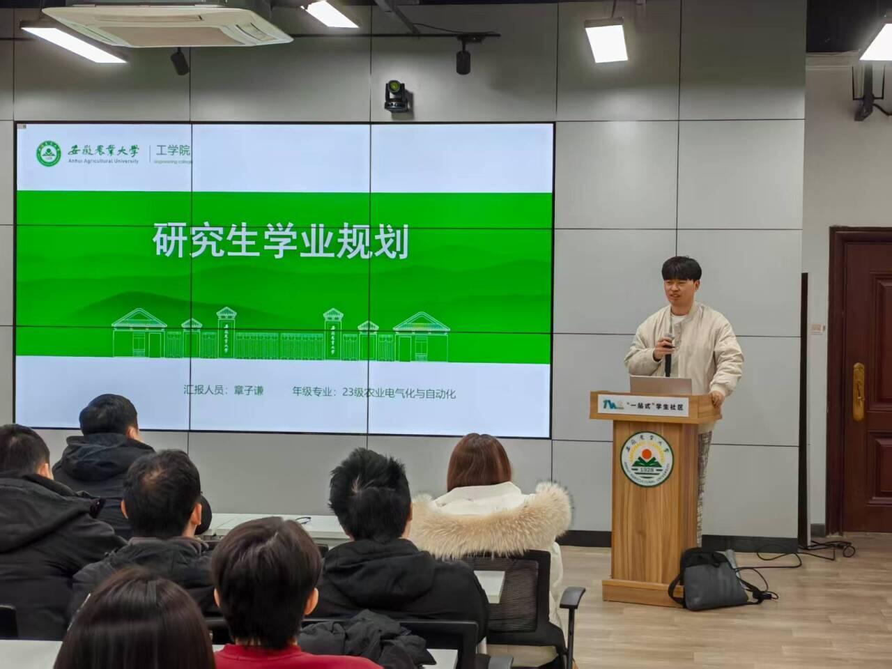 会上,2023级农业电气化与自动化专业章子谦围绕电动拖拉机混合储能系统的电压平抑与功率分配优化研究,系统介绍了从课题确立、理论建模、控制策略设计到实验验证的全过程。他结合已发表的高水平论文与多项发明专利,强调“多参考、多总结、多交流”的科研法则,并建议同学们合理规划研究生各阶段任务,做到“目标明确、计划有序、执行有力、劳逸结合”。