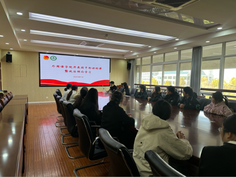 本网讯 2025年11月27日,外国语学院在506会议室开展团干部讲团课暨2025年下半年新发展团员入团仪式。学院团委老师、优秀团员代表与新发展的16名团员共同参加此次活动。