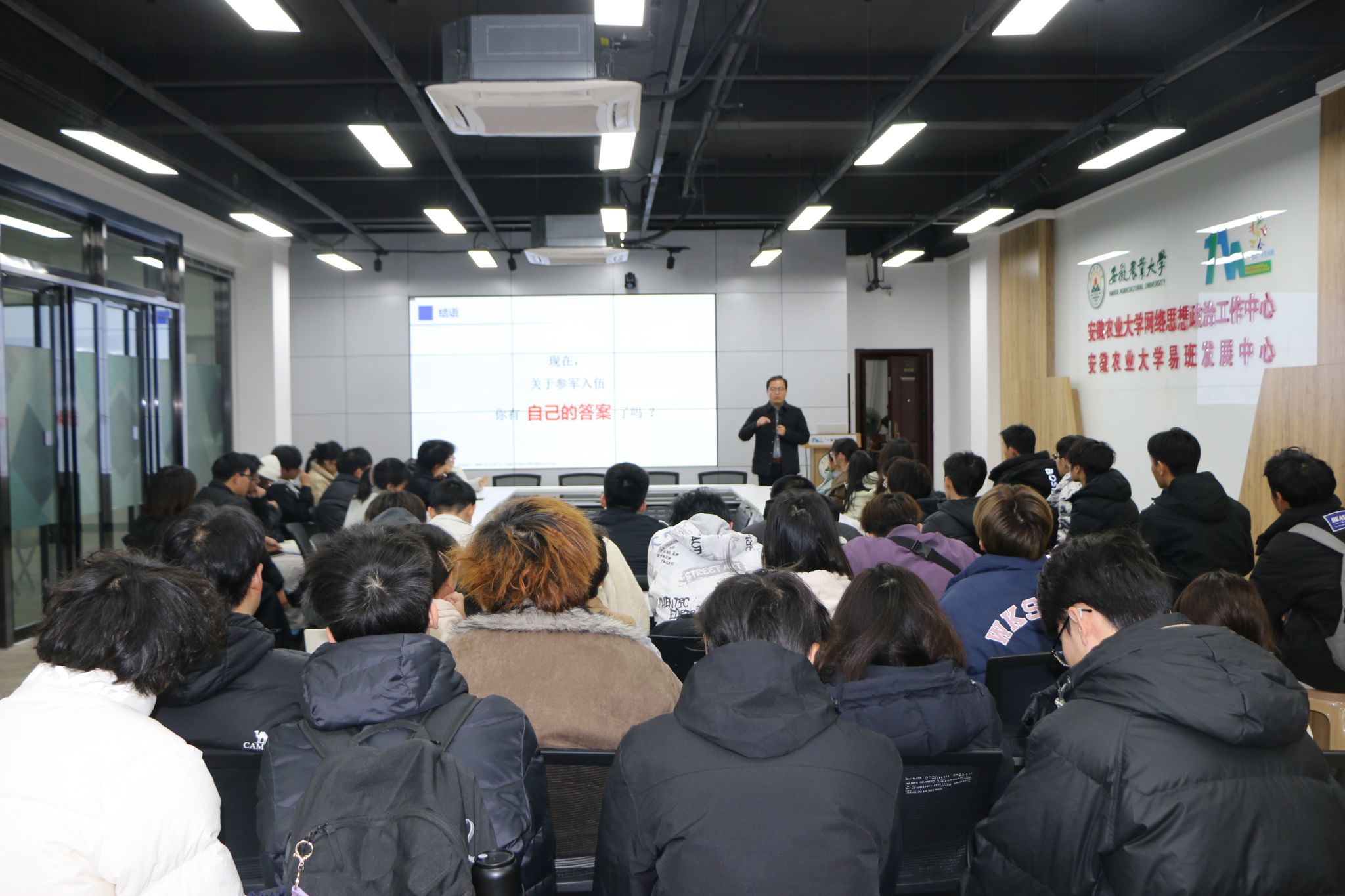 12月15日下午,学院在“一站式”学生社区南区召开国防教育暨征兵入伍动员会,2024级和2025级共52名学生代表参加。学院党委副书记、纪委书记周涛围绕国防安全形势、征兵政策解读、入伍优待福利等内容展开宣讲,结合往届优秀入伍学子的军旅生涯故事,号召同学们怀揣家国情怀,积极投身国防建设事业,将青春热血挥洒在强军兴军的征程上。互动答疑环节中,同学们踊跃提问,负责老师就入伍体检标准、学籍保留、退伍政策等问题逐一细致解答。