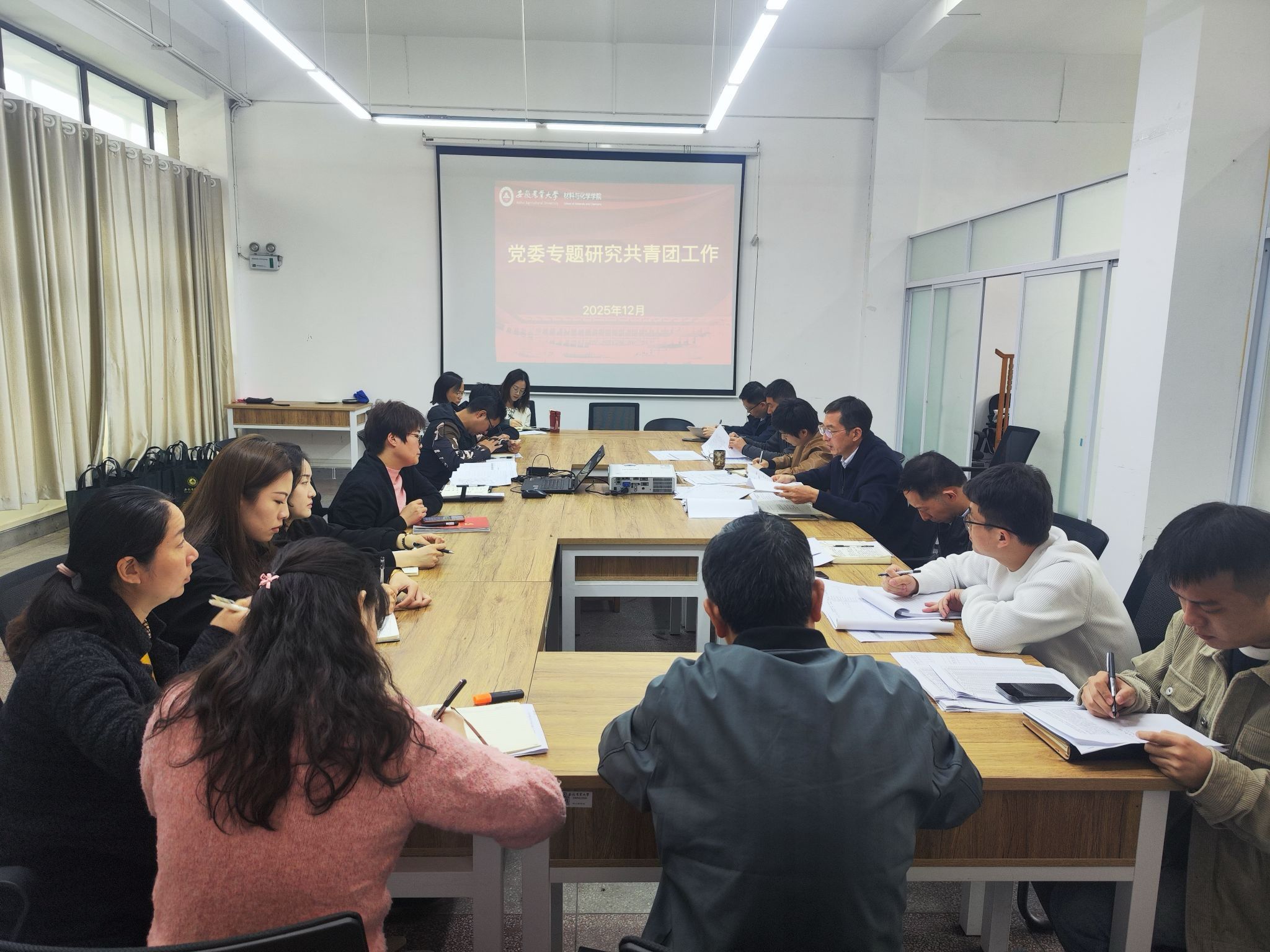 本网讯 为深入贯彻落实习近平总书记关于青年工作的重要思想,进一步强化党建带团建机制,推动学院共青团工作高质量发展,12月1日,材料与化学学院于材化楼309会议室召开党委会专题研究部署共青团工作,听取学院共青团工作汇报,并就新形势下加强和改进共青团工作及学生思想政治引领进行深入研究和部署。