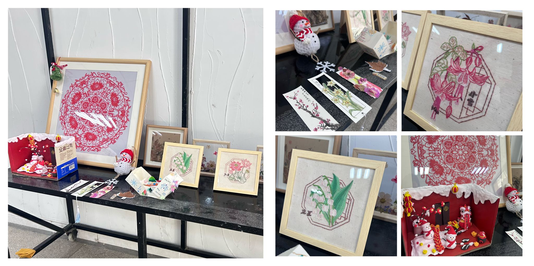 展览现场,一幅幅精致的刺绣作品错落陈列:既有以冬至团花为灵感的红色剪纸风绣品,纹样中暗藏材化专业常见的 “分子结构纹理”;也有绣着荷花、兰草的雅致小品,绣线配色借鉴了化学颜料的色谱原理。展台一角,带着雪花装饰的手工礼盒与冬至主题玩偶相映成趣,礼盒包装则运用了材料专业的环保涂层技术,兼顾美观与实用。