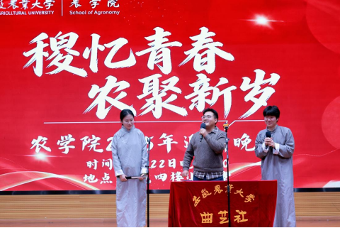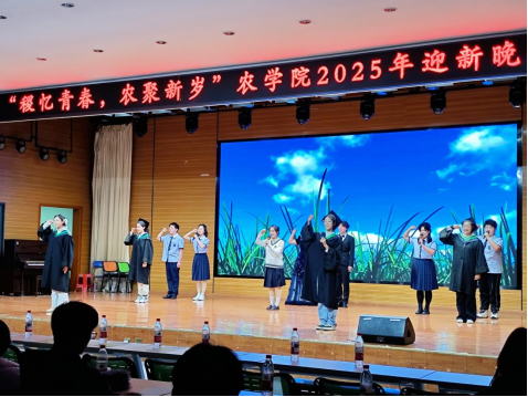 晚会开始,由退休教职工们带来扇子舞《木兰辞》瞬间点燃现场氛围。相声《麦香幸福》以诙谐台词引得台下笑声不断;合唱《黑夜问白天》《红尘客栈》及钢琴与合唱结合的《落叶归根》,用悠扬歌声传递细腻的情感;朗诵《以青春沃野,赴振兴之约》字字铿锵,抒发了农科学子扎根田野、助力乡村振兴的壮志。小品《你的问题》聚焦校园生活引发共鸣,歌舞剧《经典咏流传》融合古典诗词与现代歌舞,尽显传统韵味;喜剧《肥瘦江湖:“食”战到底》将欢乐氛围推向高潮,幕布剧《大学》细腻勾勒大学生活的温暖与美好。洪志生抽取飞花令主题词,卢杰、余恩、柳洁参与学生游戏互动环节,现场掌声与欢呼声此起彼伏。最后,晚会在学院老师们对新生的祝福视频中画上圆满句号。