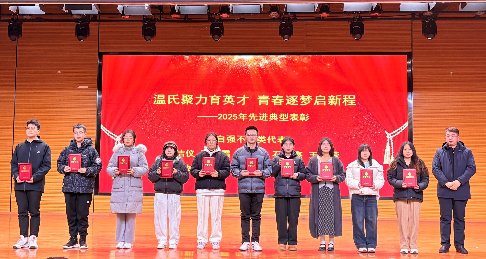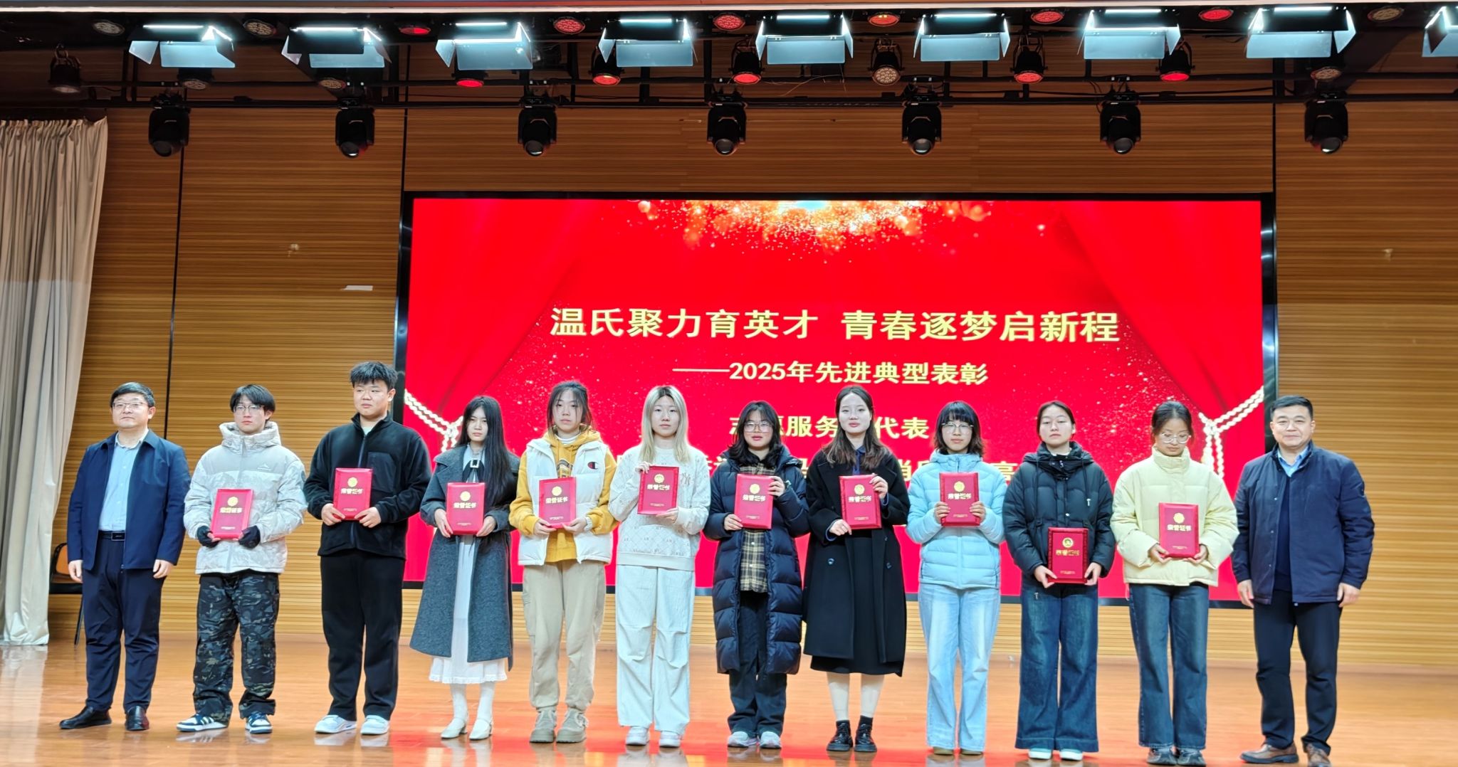 大会对在过去一年中表现突出的先进个人进行了集中表彰。共评选出学习优异类、创新创业类、文体先进类、志愿服务类、自强不息类五大类别共计465名获奖同学,表彰奖励由安徽温氏赞助。与会领导嘉宾分别为各类获奖学生代表颁发了荣誉证书。