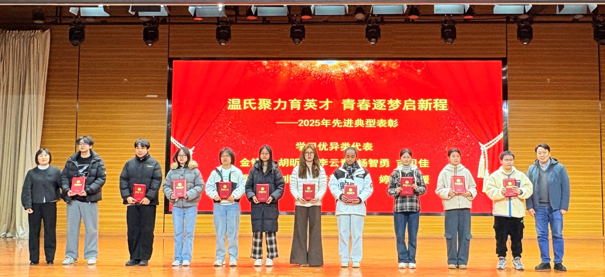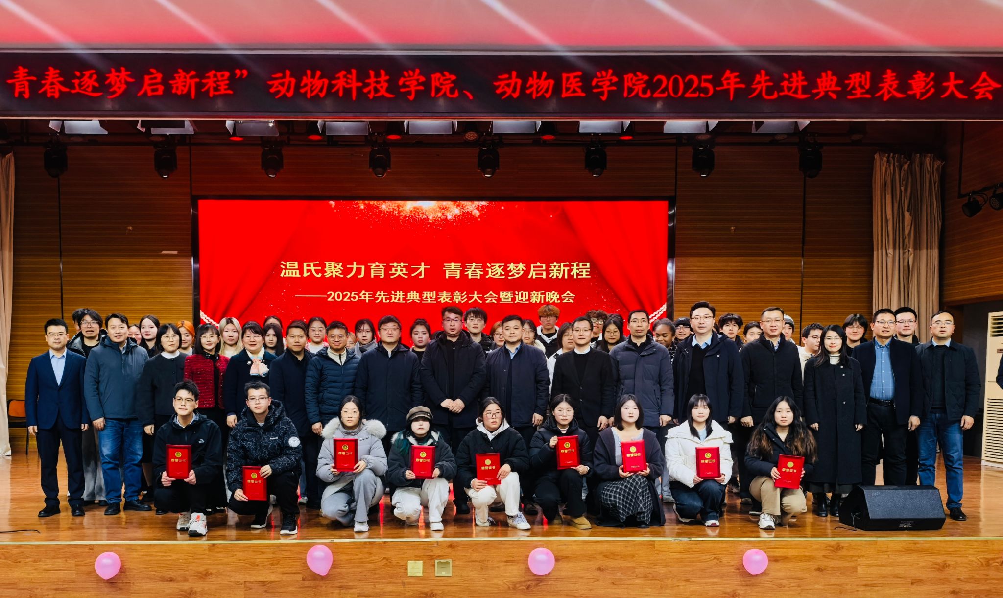 本网讯 12月26日,动物科技学院、动物医学院举办“温氏聚力育英才、青春逐梦启新程”2025年先进典型表彰大会暨迎新晚会。安徽温氏总经理张呈文、行政综合部经理祝宝璐、人力资源经理凡敏,校党政办公室、党委组织部、党委宣传部、教务处、学生处、校团委负责人,动科、动医学院党政领导班子、系主任、教师代表、全体辅导员与学生代表500余人欢聚一堂,共襄盛会。