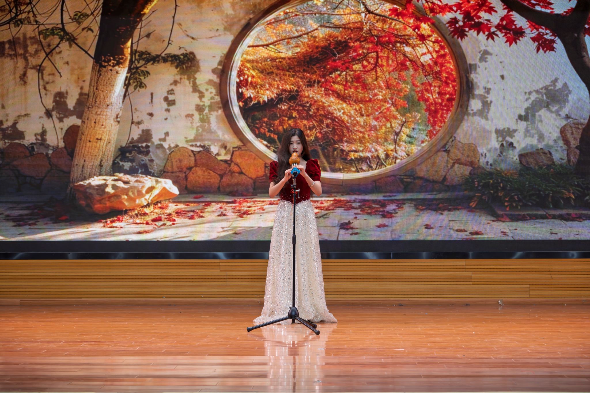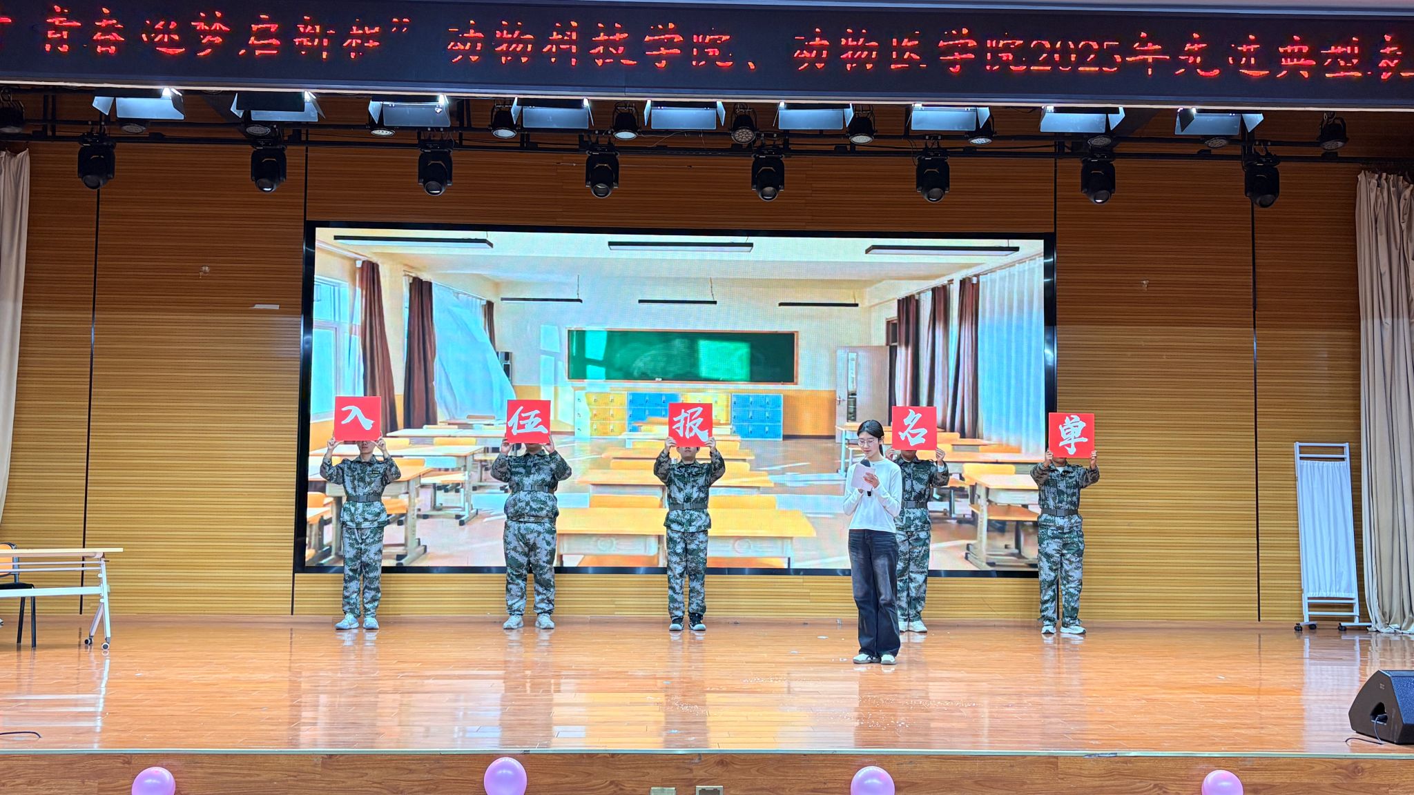 在随后举行的迎新晚会中,两院学子呈现了一场精彩纷呈的文艺演出。合唱《簇拥烈日的花》唱响了青年的爱国热忱与蓬勃朝气;葫芦丝独奏《金色的孔雀》展现了民族音乐的独特魅力;小品《宿舍反诈骗宣传》以生动诙谐的方式提升了同学们的防骗意识;歌曲《牧马城市》唱出了从青涩到担当的成长心声;情景剧《迷彩之约》深情演绎了学子投身国防、热血报国的志向;最后,激昂恢弘的大合唱《我爱你中国》将全场气氛推向高潮,表达了动科动医学子对祖国的深厚情感与坚定信仰。晚会中间穿插的抽奖环节,也为现场增添了阵阵欢声笑语。