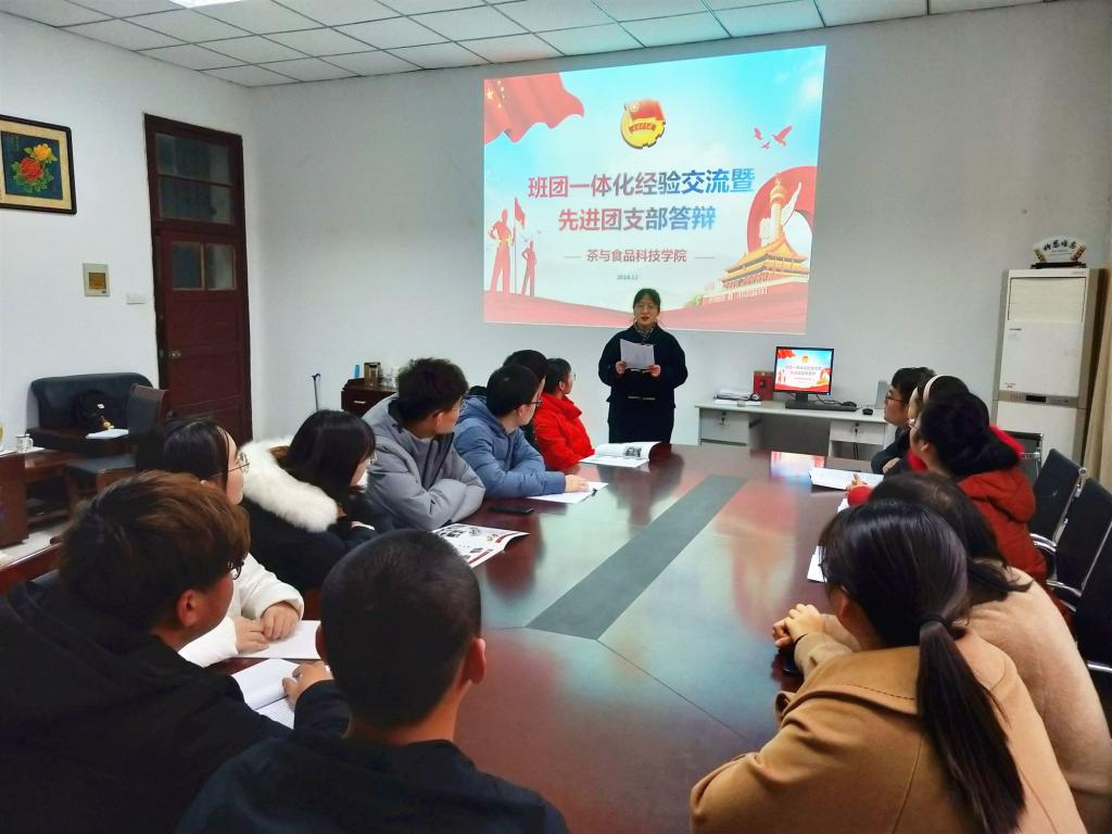 塑造团学品牌,强化思想引领。12月13日,茶与食品科技学院召开团支部大会,开展团支部班团一体化工作验收和先进团支部答辩评审,2018级食品质量与安全专业团支部等4个团支部被评为先进团支部。“做现代茶人,建功新时代”2018级茶学专业双创型团支部和“思想引领正青春,与时俱进新时代”2018级茶文化与贸易专业思想引领型团支部分别通过学校特色团支部验收。通过团支部品牌化的打造,努力形成以组织力为支撑、以引领力为牵引、以服务力为推动,全面协同发力、整体提升团的吸引力凝聚力和战斗力的新局面。