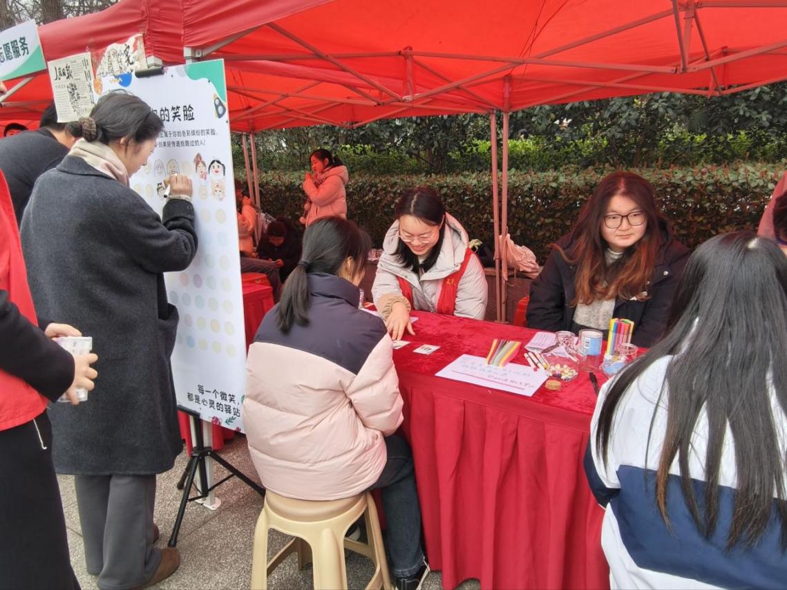 活动现场设置了三个特色互动板块。笑脸墙上,同学们用心绘制多彩笑脸,传递温暖与正能量;欧卡牌体验区,志愿者引导参与者借助图卡开展自我探索与情绪表达;烦恼许愿瓶环节,大家将烦恼与心愿写在星星纸上,折叠后投入瓶中,在沉浸式体验中舒缓压力、释放情绪、寄托美好期许。丰富有趣的活动形式吸引了众多师生前来参与体验。