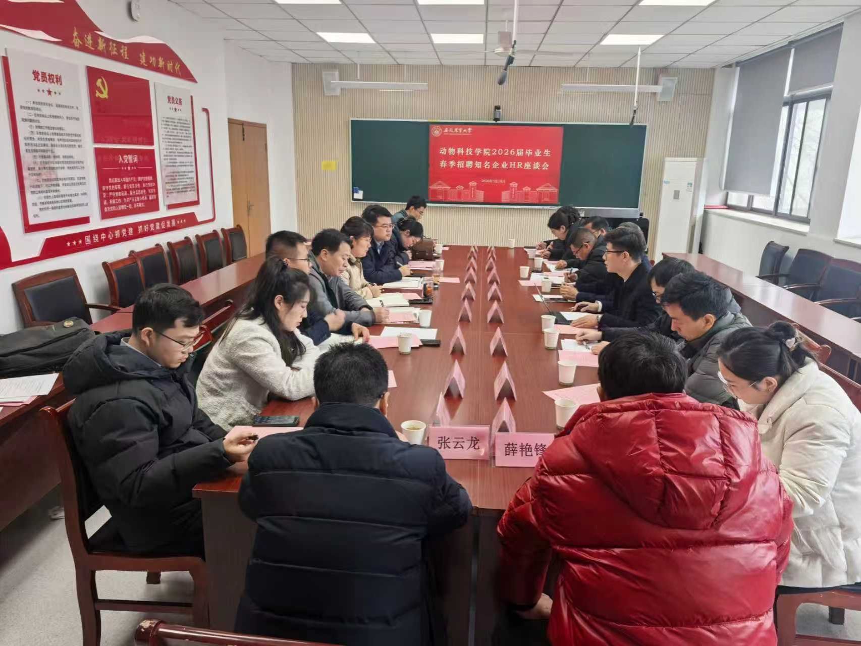 本网讯 3月18日上午,学院举办2026届毕业生春季招聘知名企业HR座谈会。牧原集团、正大集团、双胞胎集团、海大集团、通威集团、伊利集团、新希望六和、唐人神、天康畜牧、天邦汉世伟、福建傲农集团、安徽扬翔股份等12家农牧企业人事负责人受邀参会。校党委学工部副部长、学生处副处长汪小强,学院领导班子成员出席座谈会。会议由学院党委书记沈兆梅主持。