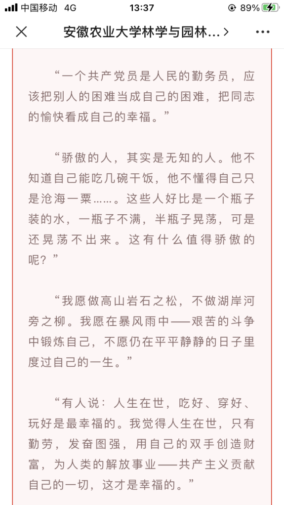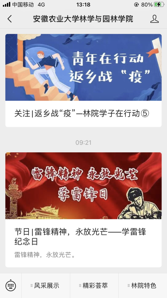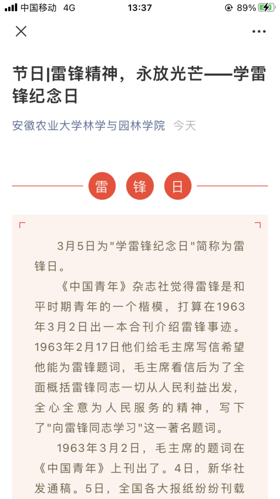 3月5日通过微信平台广泛宣传学雷锋纪念日,充分使学生认识到雷锋精神是中华民族传统美德的一种积淀,是一种随着时代进步而不断发展的与时俱进的精神。雷锋那种全心全意为人民服务,把有限的生命投入到无限的为人民服务中去的精神,那种干一行爱一行钻一行,立足岗位艰苦奋斗的敬业精神,那种对同志、对群众像春天般温暖,舍己为人、助人为乐的精神,都是在构建和谐社会中必须大力发扬和倡导的。