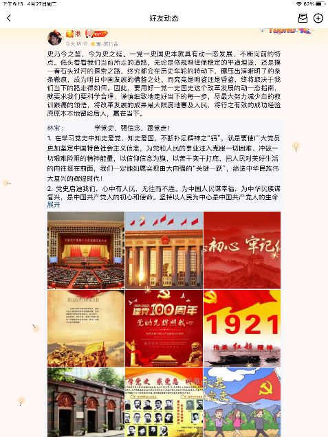 学院各班级团支部积极组织青年团员转发专业官Q动态、附加自己的感想、学习并拍摄学习党史的学习照片进行网络宣传、每个同学手写有关学习党史及党的发展过程的感想、召开有关班会进行集体学习党史等,以饱满的热情和更强的斗志,在新征程上谱写新时代的青春之歌。