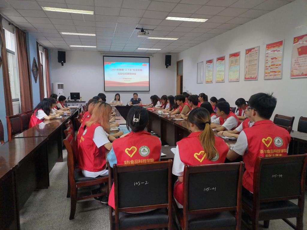 本网讯 7月16日,茶与食品科技学院2021年暑期“三下乡”社会实践出征仪式暨培训会在茶业楼105会议室举行。学院党政领导、团委老师、辅导员代表、指导教师、全体实践学生参加了出征仪式,仪式由学院团委老师主持。