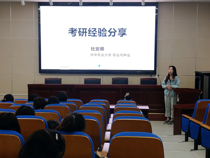 5月1日下午七点,园艺学院在二教245报告厅举办了考研经验分享会,本次分享会请到了园艺学院刘萍(上岸北京林业大学)、李治梅(上岸南京农业大学)、王诗友(上岸南京农业大学)、马李广(上岸华中农业大学)、杜安娜(上岸华中农业大学)五位学长学姐为新一届考研学子分享他们考研中的经验和方法。“一旦确定好目标,就要不断努力,坚持下去”,这是每位学长学姐都提到的,也是需要我们做到的。本次分享会听到了满满的考研信息,有助于同学们更好规划自己的未来。