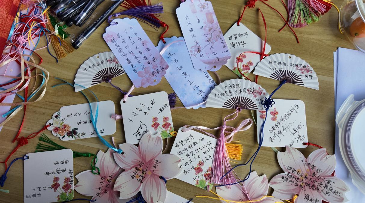 本次雅集活动设三个部分,诗歌朗诵环节,同学们深情演绎席慕蓉《我喜欢春天》、林徽因的《你是人间的四月天》;书签心意表达与诗谜竞赛环节,大家以诗句书写春日心绪,并在“基础—中阶—高阶”的趣味竞答中重温经典,现场掌声与欢笑不断;文学短剧表演环节,原创剧目《穿越时空的对话,遇见诗人》以简练道具与台词,呈现古今对话场景,传递“盛世如愿,薪火相传”的深情寄寓,令在场观众动容,最后活动在揭晓诗谜谜底中圆满落幕。