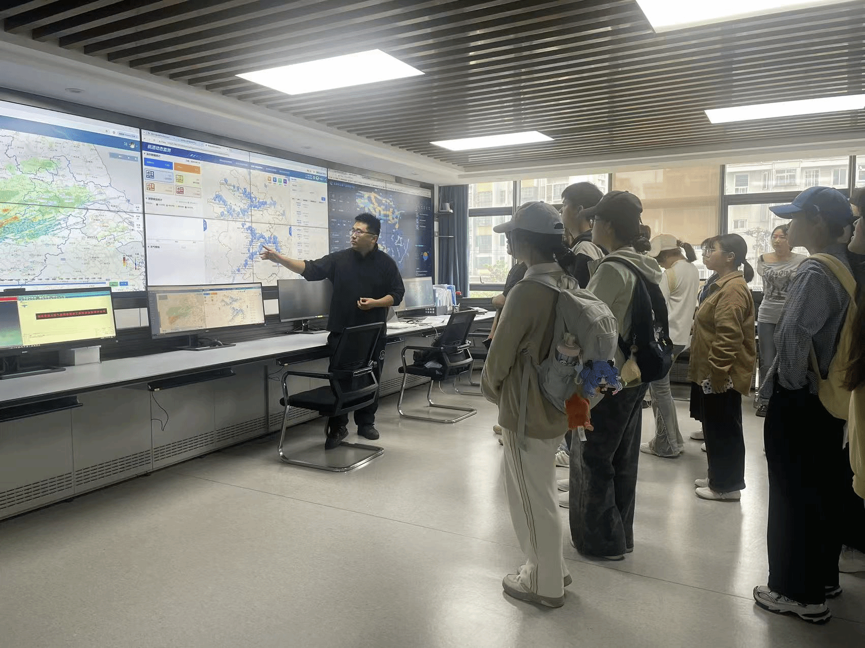 在工作人员的带领下,大家先后参观了交通预警气象平台、气象影视中心及天气预报制作中心、详细了解气象观测、数据处理、预报发布等工作流程,直观感受交通气象预警与气象影视制作的实际应用。参观过程中,同学们认真聆听讲解,积极交流提问,将理论知识与行业实践紧密结合,进一步体会到气象工作在生产生活与防灾减灾中的重要作用。